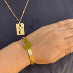 Incluye una pulsera con candado en forma de corazón y un collar con la llave complementaria, diseñados para simbolizar unión, amor y exclusividad entre dos personas.